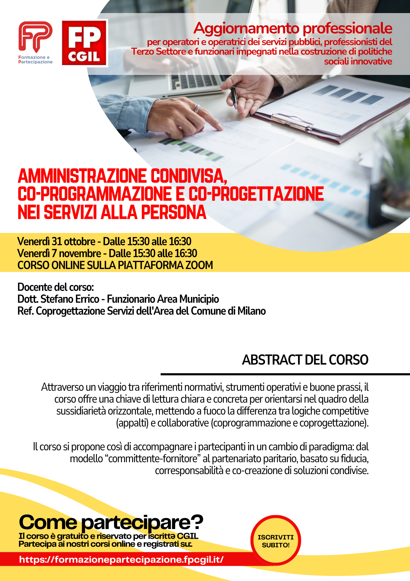 Il corso “Amministrazione condivisa, coprogrammazione e coprogettazione nei servizi alla persona” propone un percorso formativo dedicato a operatori e operatrici dei servizi pubblici, professionisti del Terzo Settore e funzionari impegnati nella costruzione di politiche sociali innovative.